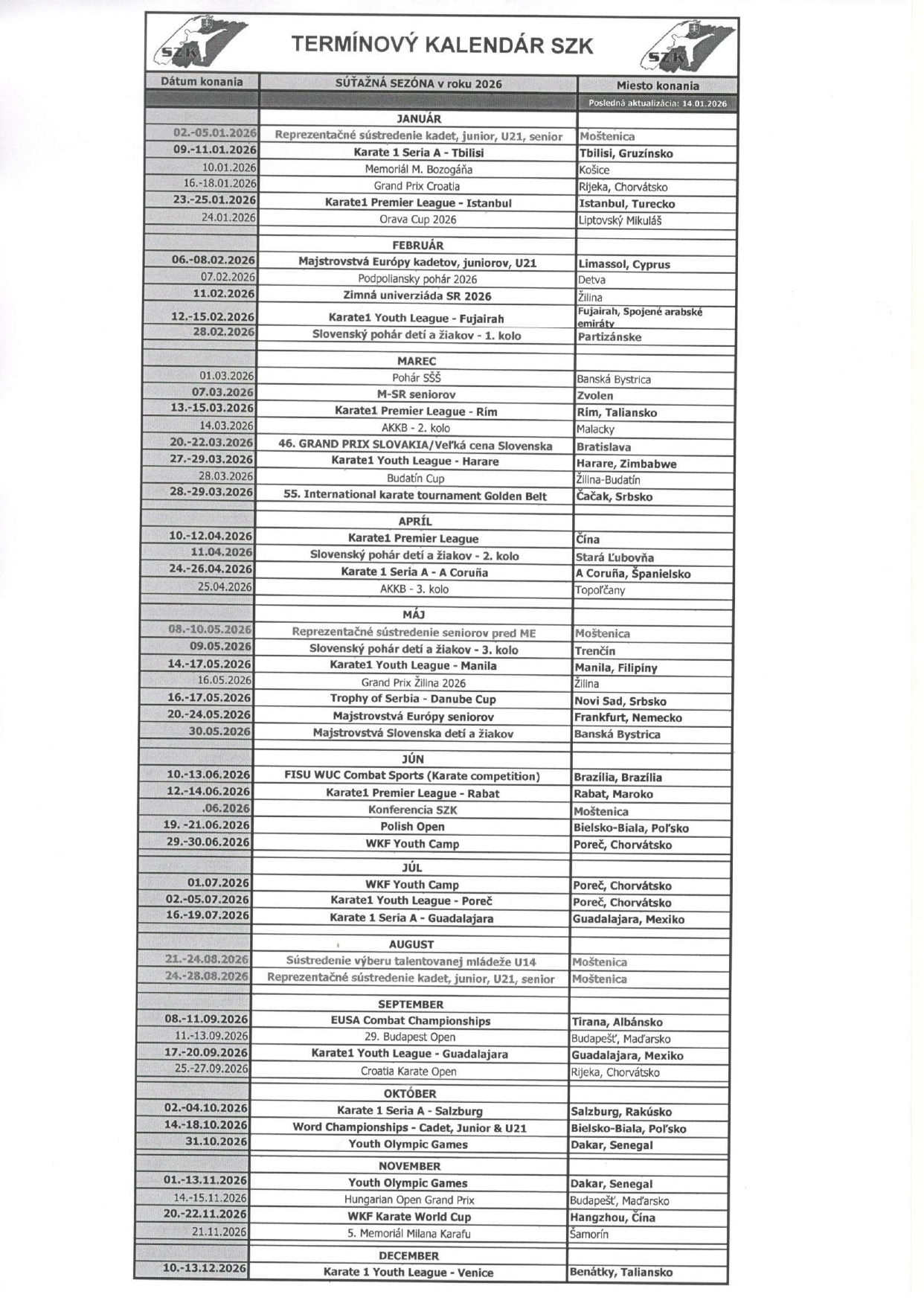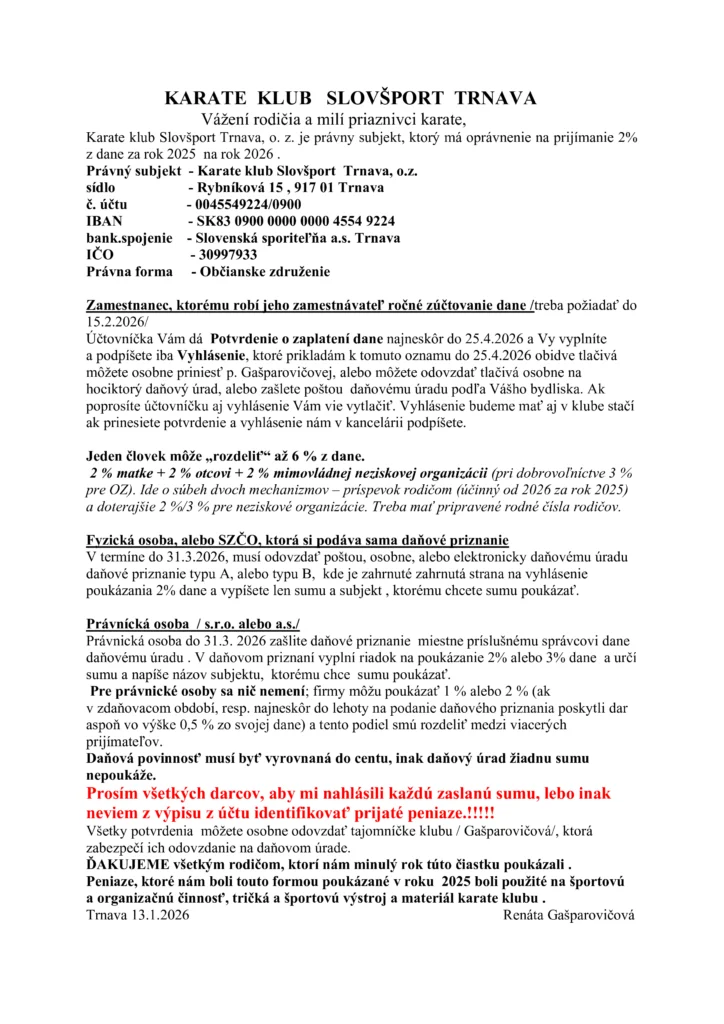 Športová činnosť Karate klubu Slošport Trnava, o.z., je realizovaná počas celého roka s finančnou podporou Mesta Trnava
